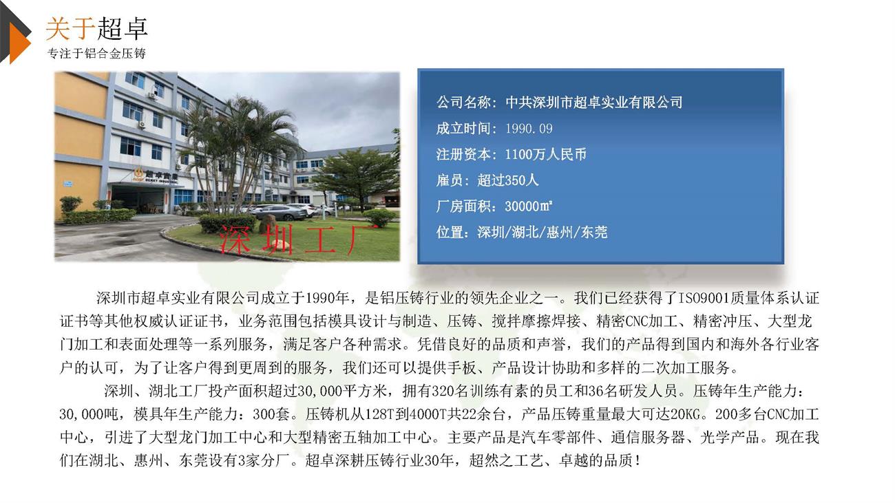 超卓從事壓鑄30年,我們的創(chuàng )新理念和經(jīng)驗能夠為您提供價(jià)格合理、品質(zhì)優(yōu)良和快速交貨的服務(wù)。