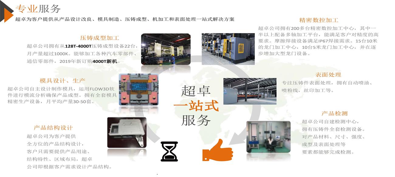 超卓為客戶(hù)提供從產(chǎn)品設計、模具制造、壓鑄成型、機加、CNC精加工和表面處理一站式解決方案。